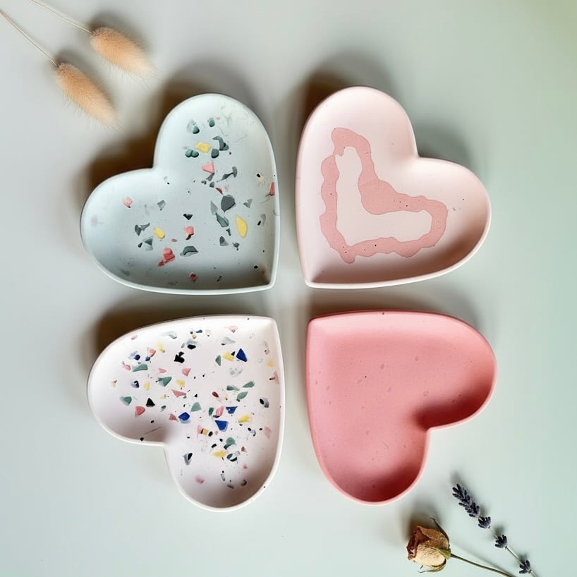 Søte Hjerteskål er støpt i Jesmonite som er et mineralbasert miljøvennlig komposittmateriale