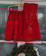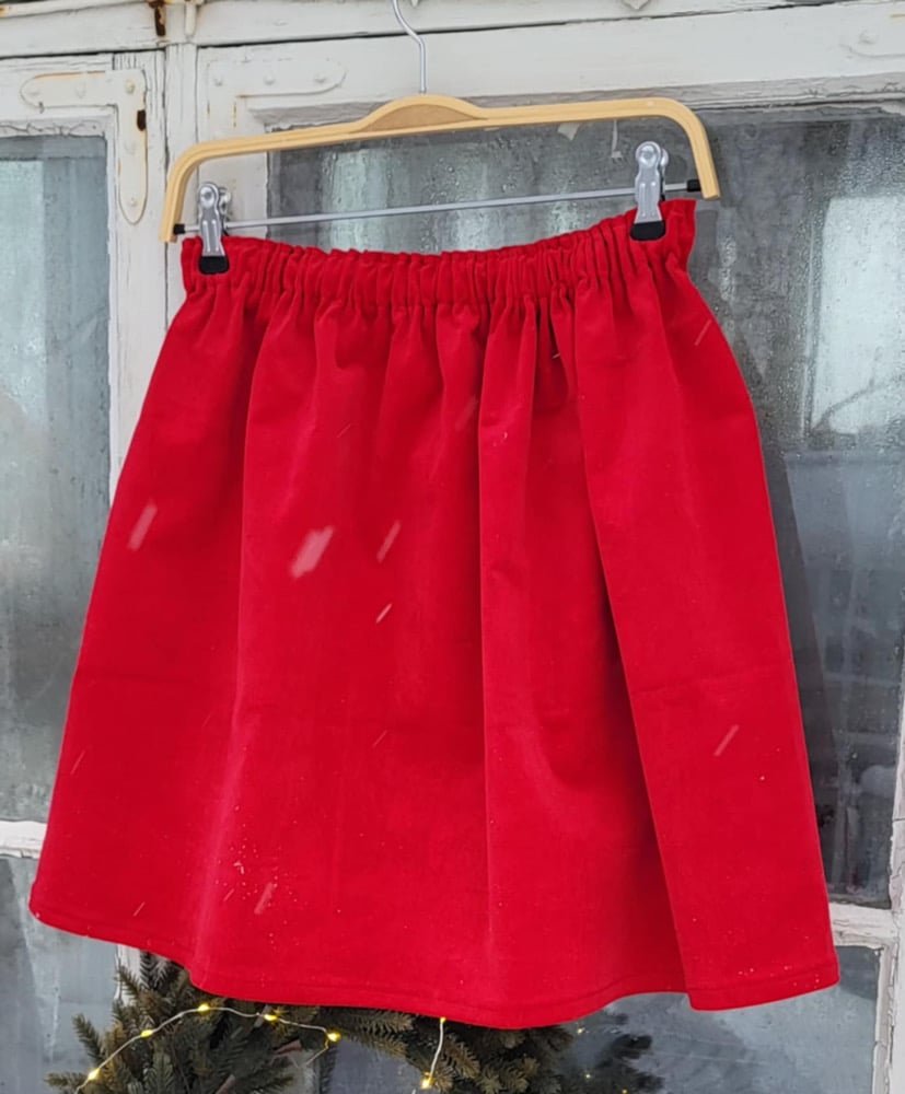Smalstripet fløyel i julerød bomull. Det perfekte juleskjørtet. Bred strikk i midjen.