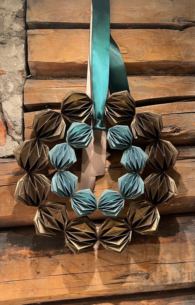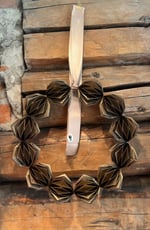 Kaffefarget origami krans med cappuccinofarget sløyfe. Ca. 40 cm i diameter.
